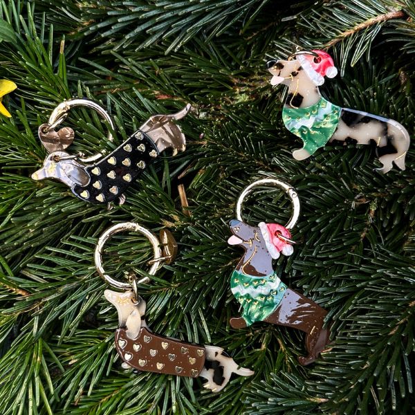 Dieser liebevoll gestaltete Dackel Schlüsselanhänger bringen Stil und gute Laune an jeden Schlüssel oder jede Tasche. Es gibt drei Varianten entweder einen braunen Weihnachtsdackel, einen beigen Weihnachtsdackel und einen brauen Dackel mit goldenen Herzen – Perfekt als Geschenk oder zum Selbstbehalten.