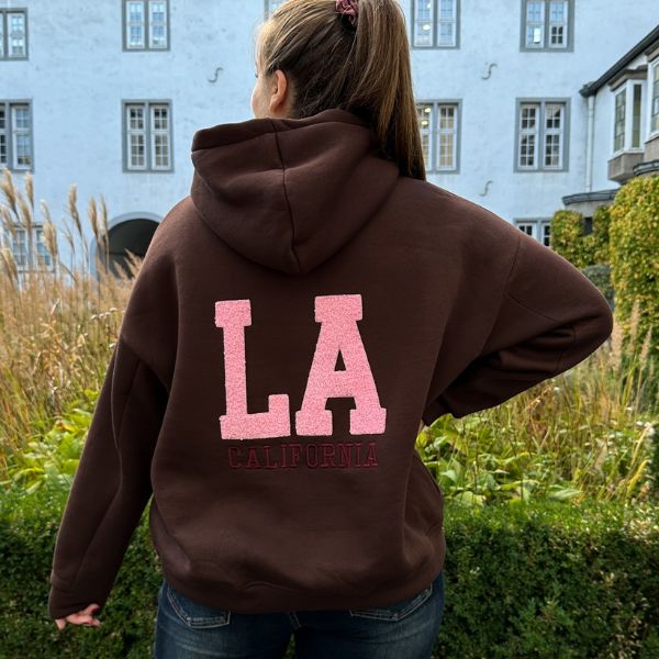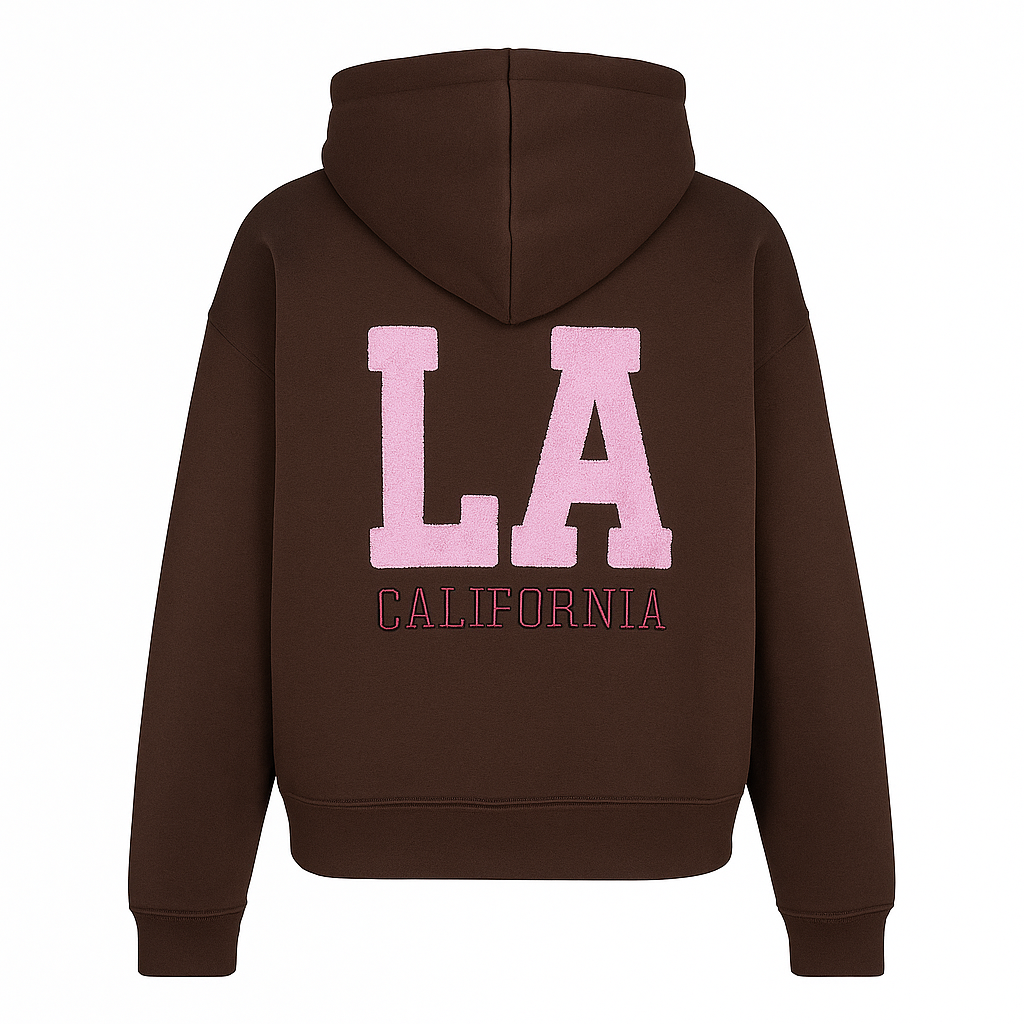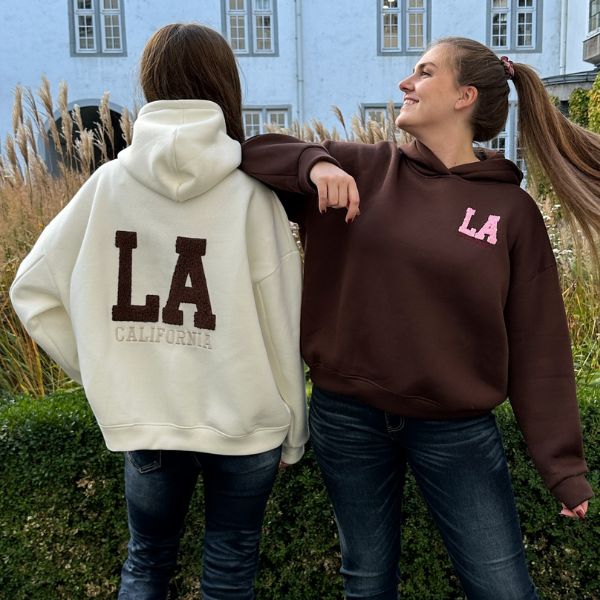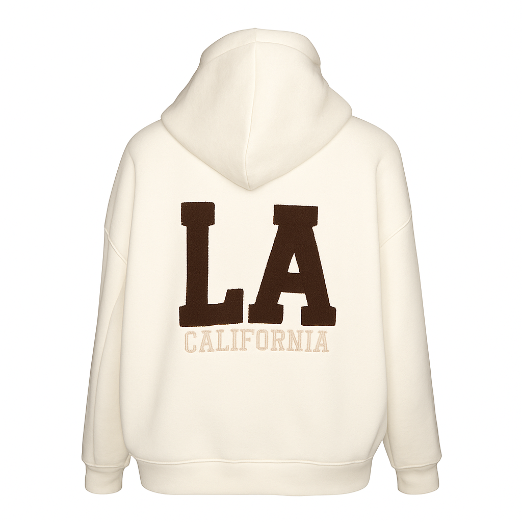 Bequemer LA Hoodie mit auffälliger College-Stickerei, verfügbar in zwei Farben. Der lässige Oversize Schnitt und das superweiche Material machen ihn zum perfekten Alltagsbegleiter.